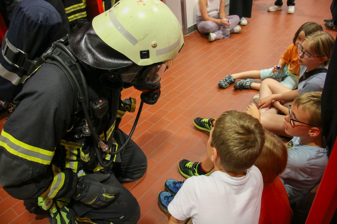 Danach ging es weiter in die Umkleide. Dort wurde den Kindern erzählt, wie ein Einsatz abläuft, welche Kleidung die Einsatzkräfte in einem Einsatz tragen und welche Ausrüstung bei einem Brandeinsatz zusätzlich benötigt wird. Zusätzlich konnten sehen, wie sich eine Einsatzkraft mit einem Atemschutzgerät ausrüstet und wie sich dann die Atemgeräusche anhören. Dies hört sich meist recht eigenartig an, doch die Kinder merkten, dass sie keine Angst haben müssen, sollten sie ein solches Geräusch hören. „Das sind die Geräusche der Feuerwehrfrauen und -männer, die euch retten wollen. Davor braucht ihr keine Angst haben“, sagte ein Feuerwehrmann.