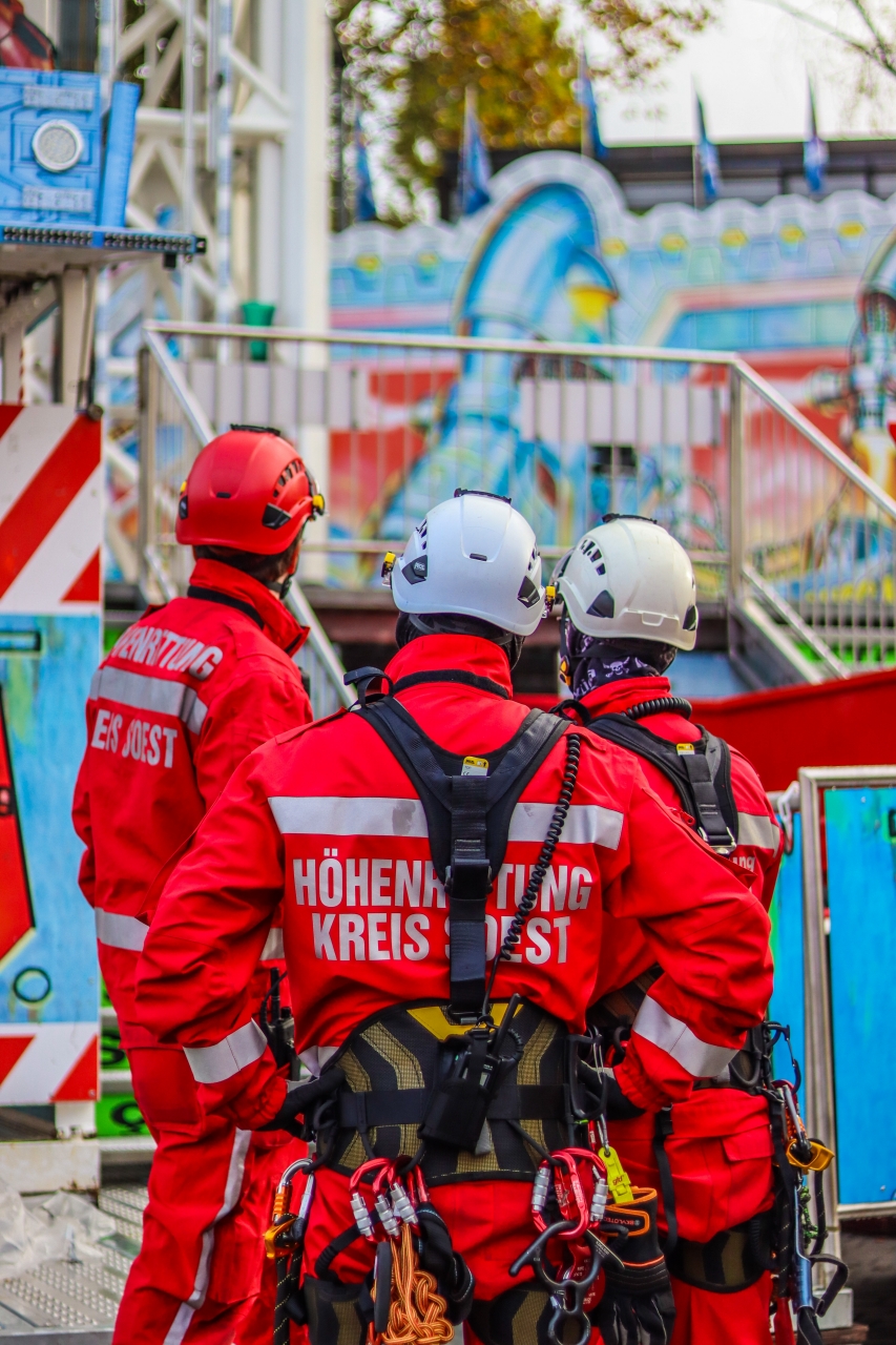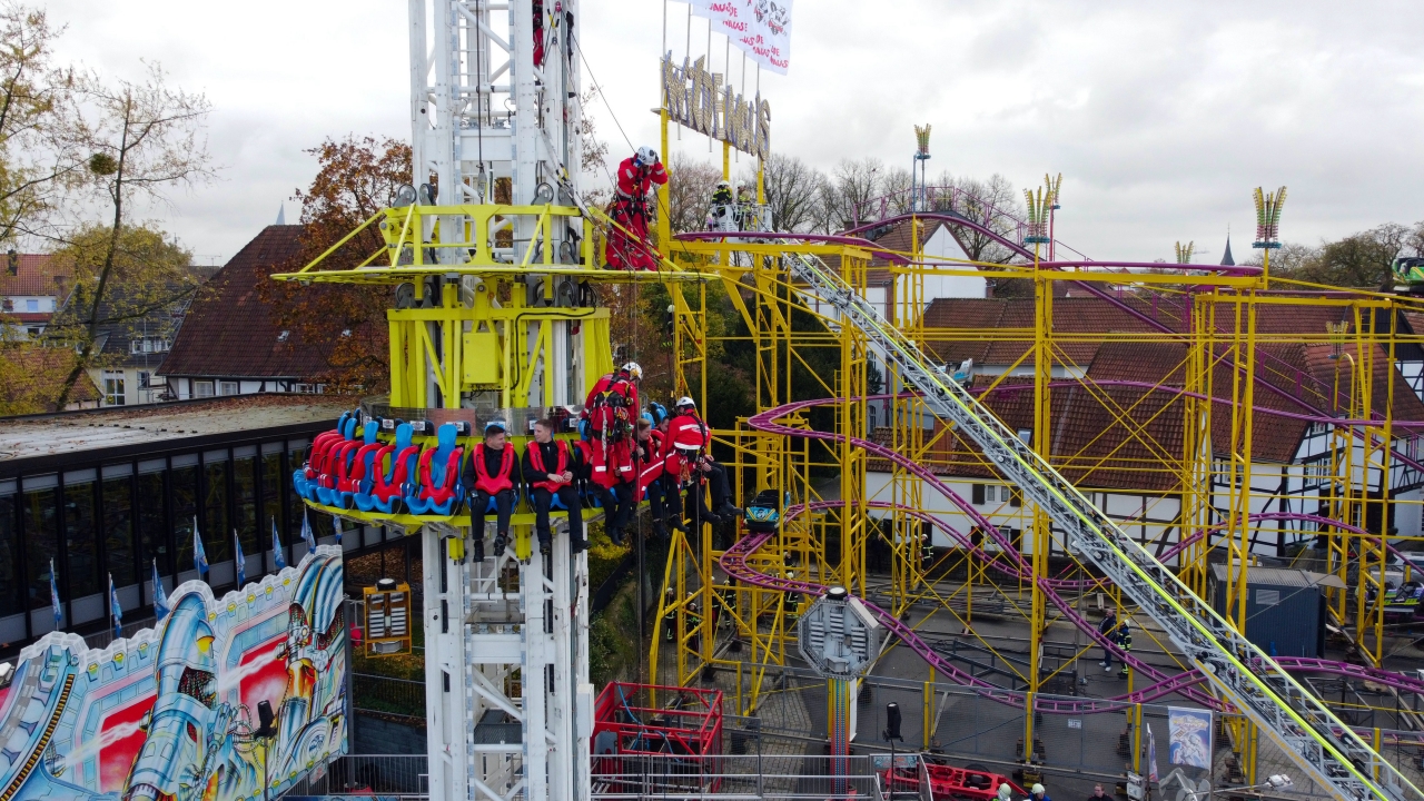 Parallel dazu übte die spezialisierte Höhenrettung des Kreises Soest am Fahrgeschäft "Skyfall" – einem Freifallturm, der die Besucher aus großer Höhe den freien Fall erleben lässt. Die Herausforderung bestand darin, Personen sicher aus großen Höhen abzuseilen. Mit professioneller Ausrüstung und präziser Technik sorgte die Höhenrettung dafür, dass Personen kontrolliert und sicher zum Boden abgelassen wurden. Diese Übung stärkte das Team weiter im Umgang mit anspruchsvollen Rettungseinsätzen aus der Höhe.