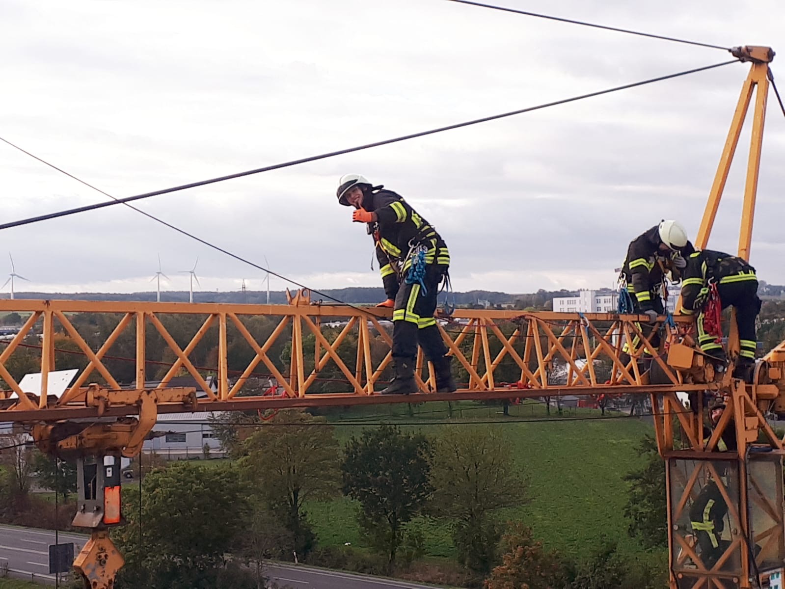 Feuerwehrleute aus Soest und Möhnesee stehen unter einem Baukran. „Schnell!“, ruft der Einsatzleiter „Der kann sich da nicht mehr lange Festhalten“