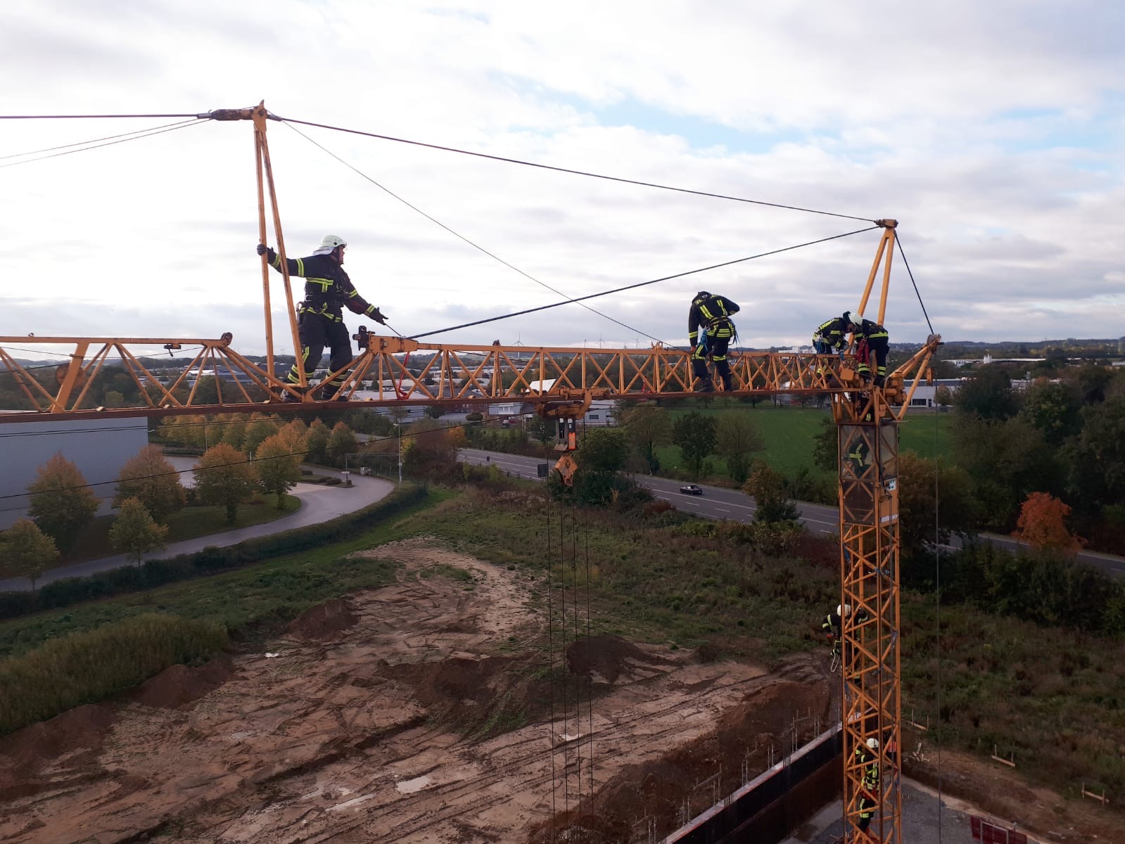 Was war geschehen? Eine Person war in den Kran geklettert und hat sich dabei offensichtlich selbst überschätzt – so lautete das offizielle Übungszenario für die Gruppe Absturzsicherung.