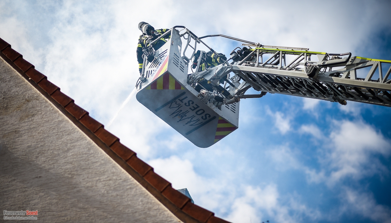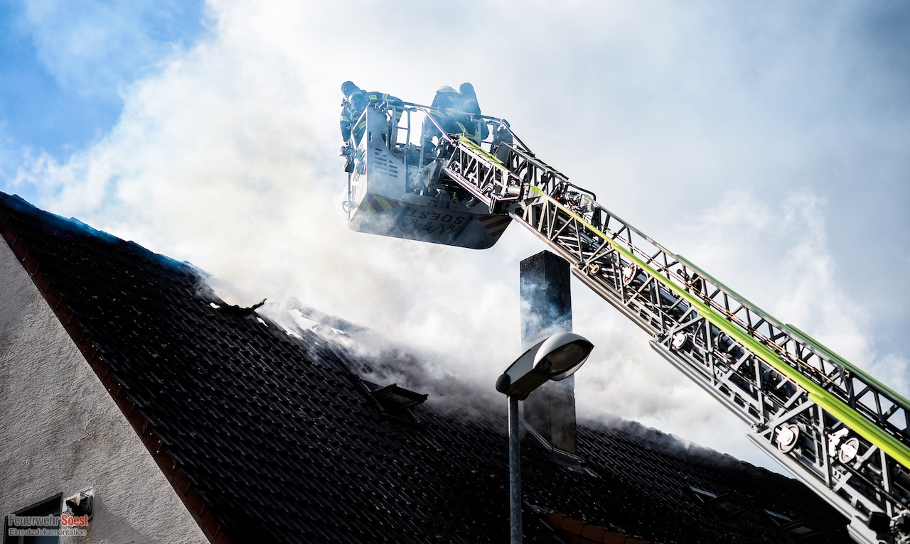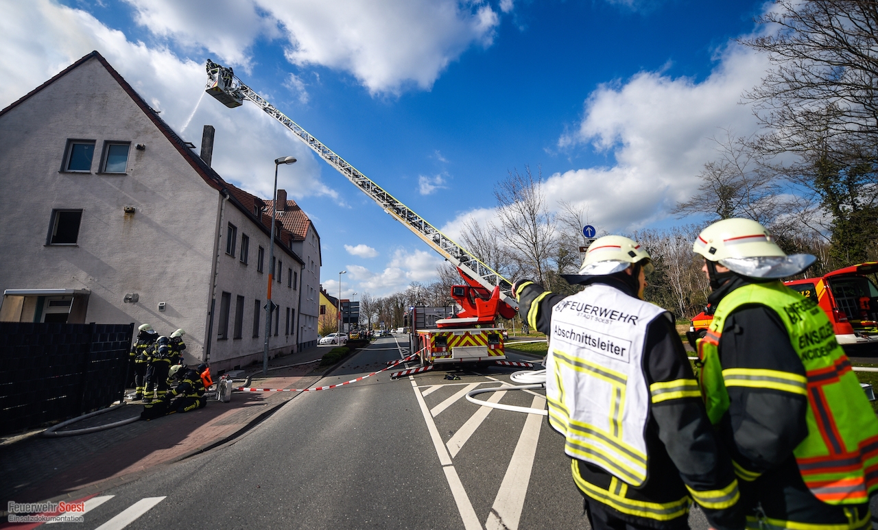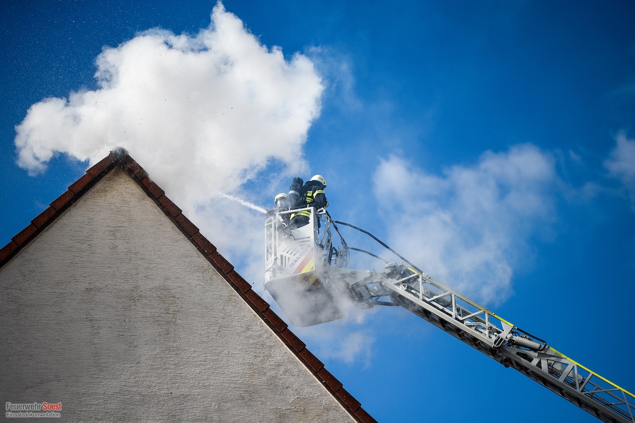Im Dachstuhl eines Mehrfamilienhauses ist es zu einem Brand gekommen. Auf der Anfahrt war direkt eine größere Rauchsäule erkennbar. Daraufhin wurde das Stichwort auf "Brand_3" geändert. Dadurch wurde der Löschzug 3 und der Löschzug 6 nachalarmiert. Außerdem wurde die Drehleiter der Feuerwehr Bad Sassendorf zur Unterstützung angefordert. Durch die Feuerwehr wurden 5 Personen aus dem Haus evakuiert. Die Brandbekämpfung wurde von außen über die Drehleiter sowie einen Trupp im Innenangriff durchgeführt. Im weiteren Verlauf des Einsatzes wurde von außen die Dachhaut geöffnet, um Glutnester abzulöschen.