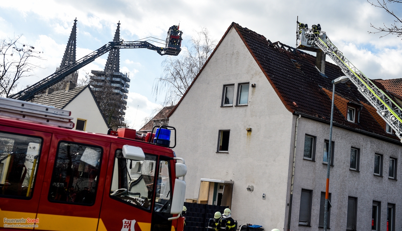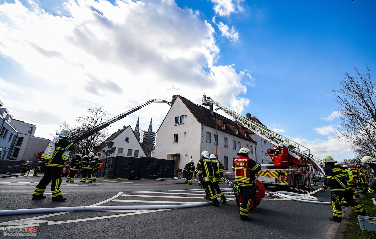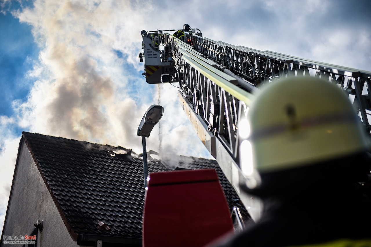 Im Dachstuhl eines Mehrfamilienhauses ist es zu einem Brand gekommen. Auf der Anfahrt war direkt eine größere Rauchsäule erkennbar. Daraufhin wurde das Stichwort auf "Brand_3" geändert. Dadurch wurde der Löschzug 3 und der Löschzug 6 nachalarmiert. Außerdem wurde die Drehleiter der Feuerwehr Bad Sassendorf zur Unterstützung angefordert. Durch die Feuerwehr wurden 5 Personen aus dem Haus evakuiert. Die Brandbekämpfung wurde von außen über die Drehleiter sowie einen Trupp im Innenangriff durchgeführt. Im weiteren Verlauf des Einsatzes wurde von außen die Dachhaut geöffnet, um Glutnester abzulöschen.