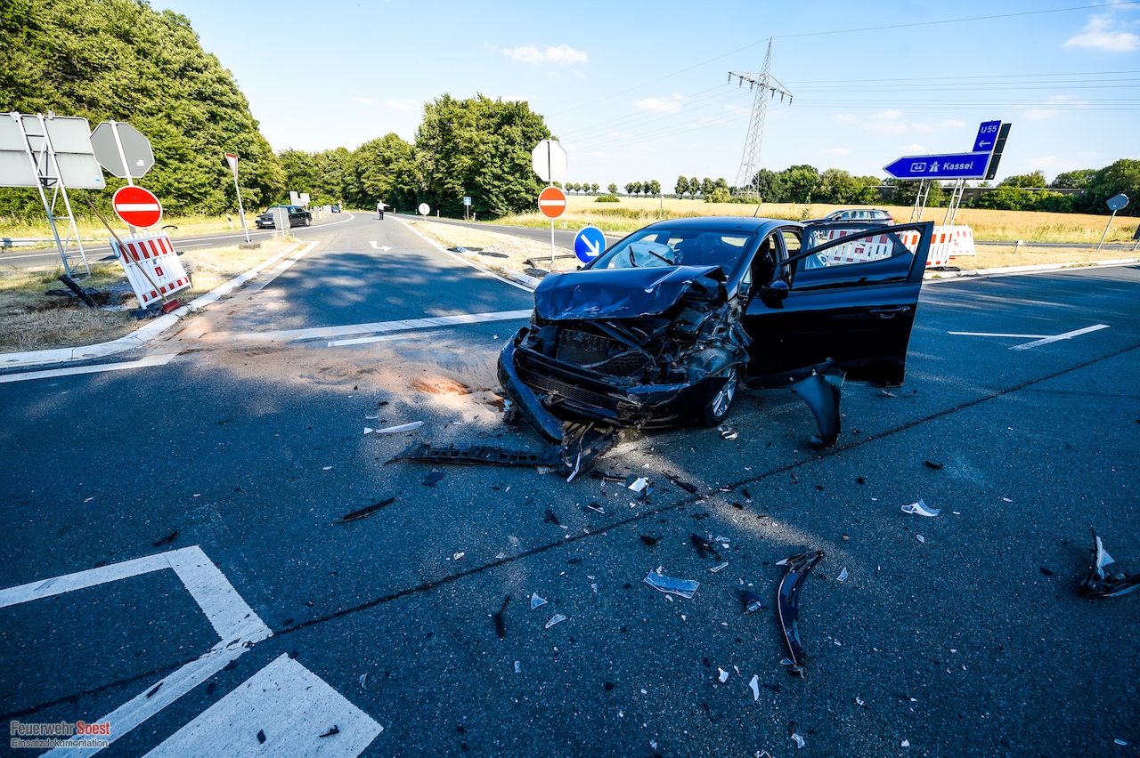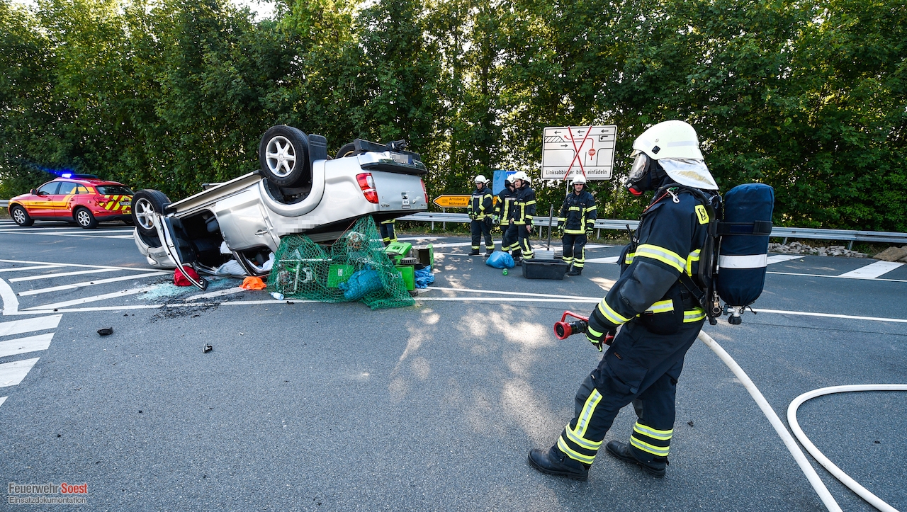Im Bereich der Autobahn-Abfahrt Soest/Möhnesee an der Arnsberger Straße waren ein Pickup und ein Kia-Kleinwagen miteinander kollidiert. Der Pickup überschlug sich und blieb auf dem Dach liegen. Insgesamt wurden vier Personen verletzt. [...]