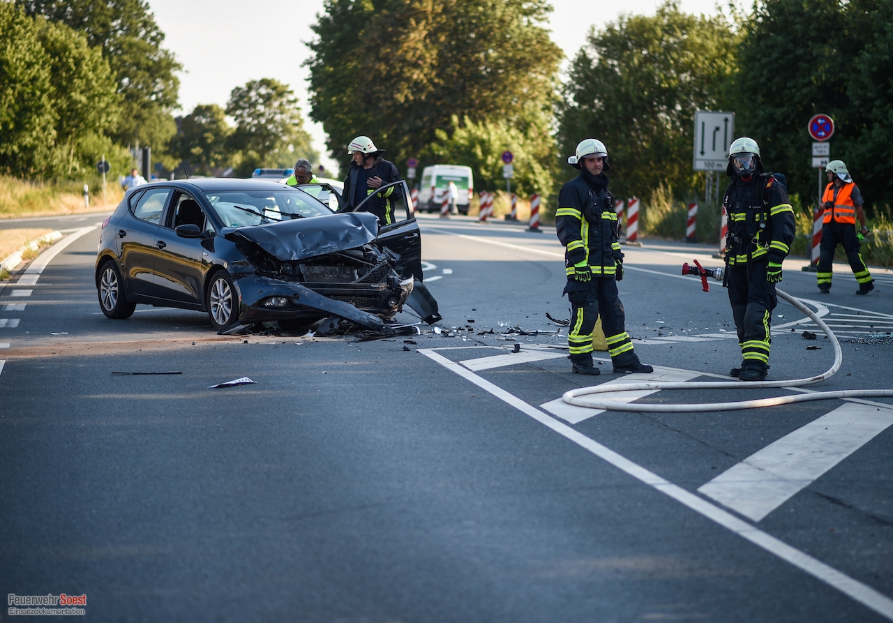 Die Feuerwehr Soest rückte mit einem Innenstadtzug, rund 25 Einsatzkräften und sechs Fahrzeugen an. Die Feuerwehrleute unterstützen zunächst bei den Rettungsarbeiten. Zudem wurden die Batterien der Fahrzeuge abgeklemmt, um die Brandgefahr zu mindern. Ein Feuerwehrmann hielt sich unter Atemschutz mit einem C-Rohr in Bereitstellung, um einen möglichen Pkw-Brand umgehend löschen zu können.