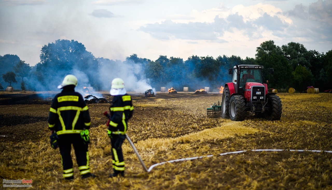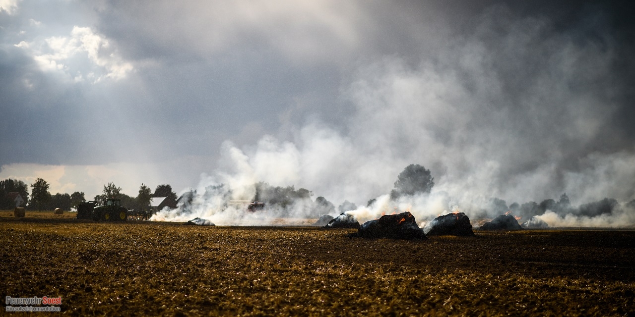 Wir wurden zu einer brennenden Rundballenpresse auf einem Feld alarmiert. Bereits bei Eintreffen der ersten Einheiten hatte sich das Feuer auf das Stoppelfeld und die darauf abgelegten Rundballen ausgebreitet. Um eine Brandausbreitung zu verhindern, wurden mehrere C-Rohre vorgenommen. Hierbei wurden wir ebenfalls durch die örtlichen Landwirte unterstützt, die mithilfe landwirtschaftlicher Geräte Brandschneisen in das Feld zogen. Im Anschluss wurde die Rundballenpresse abgelöscht. Insgesamt stand eine Fläche von ca. 4.000 m² in Brand.