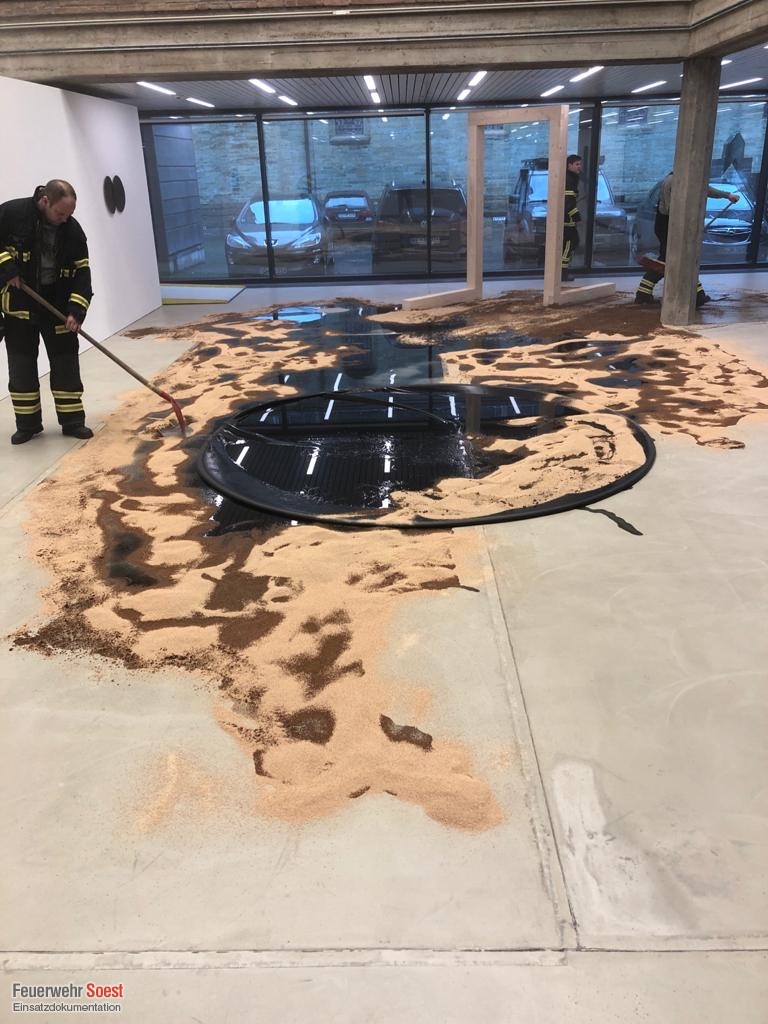 Aus einem Kunstwerk sind ca. 115 Liter Speiseöl ausgelaufen. Diese wurden durch uns mit Ölbindemittel abgestreut.
