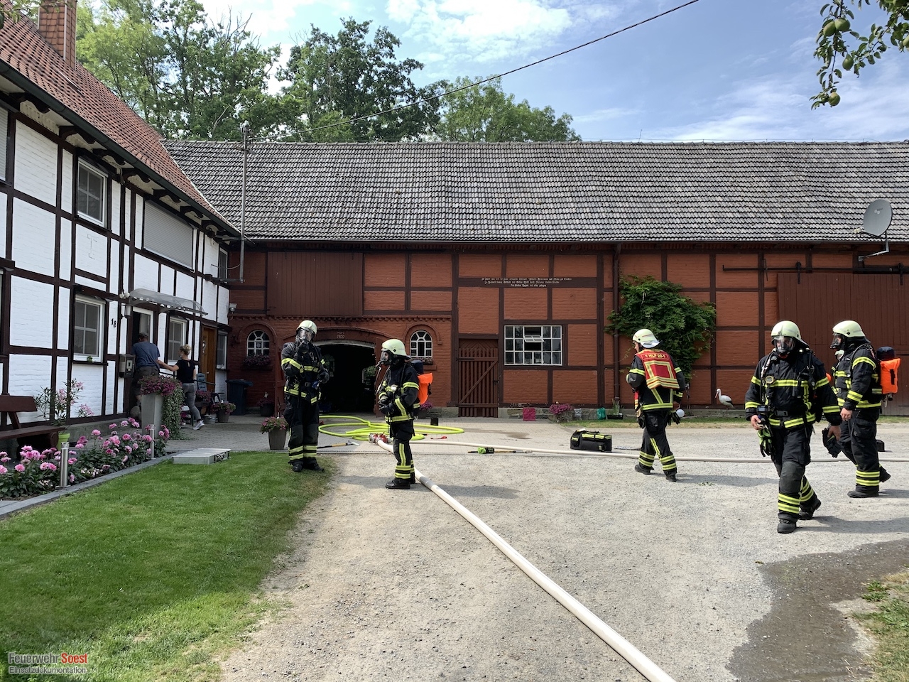In einer rund 400 Quadratmeter großen Scheune mit Wohnhaus-Anbau brach am Donnerstagnachmittag gegen 14.07 Uhr ein Feuer aus. Ein darin gelagertes Schweißgerät mit Gasflasche konnte durch den Bewohner noch rechtzeitig ins Freie gebracht werden. Ein Trupp unter schwerem Atemschutz begann direkt mit der Brandbekämpfung und konnte das Feuer schnell löschen. Ein weiterer Trupp kühlte im Außenbereich die Gasflasche des Schweißgerätes. Anschließend wurde die Scheune mit einer Wärmebildkamera auf mögliche Glutnester kontrolliert und belüftet.