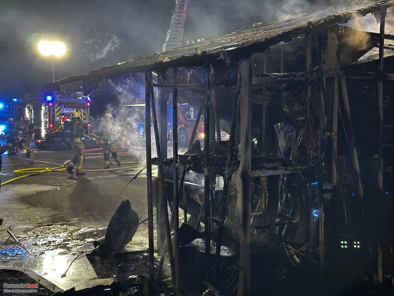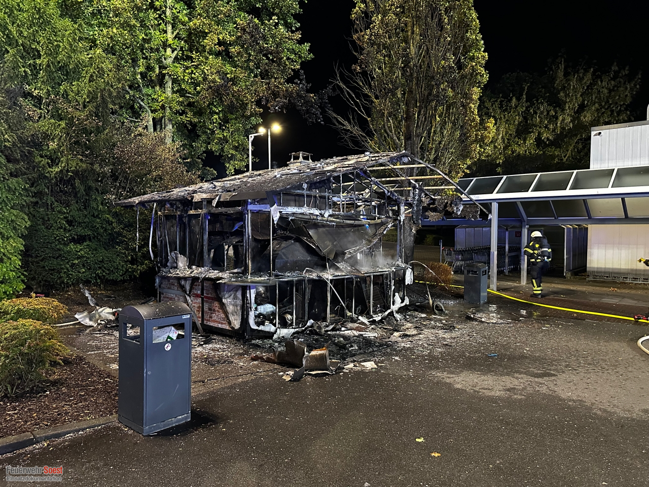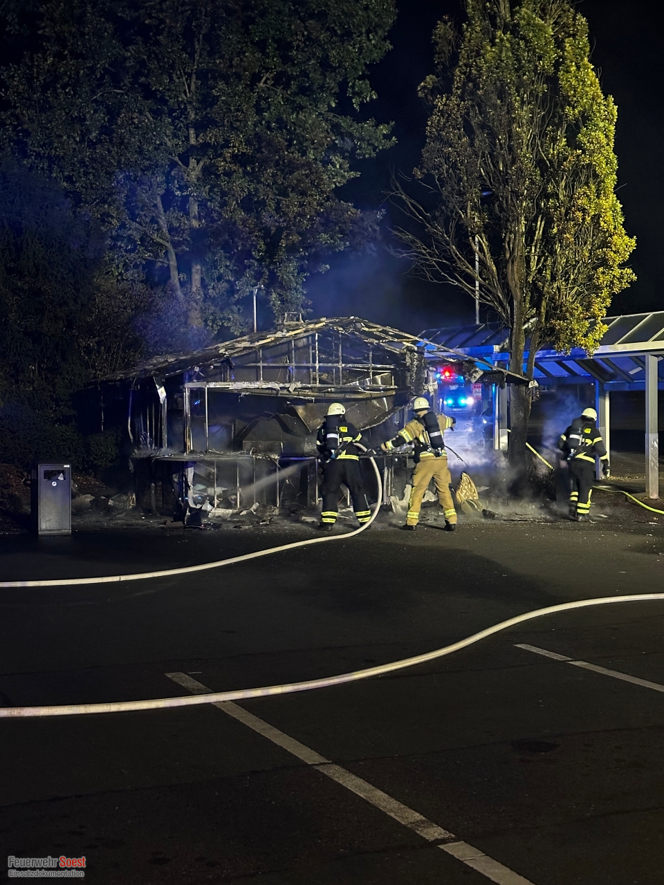 Als unsere ersten Kräfte an der Einsatzstelle eintrafen, stand der Imbissstand bereits in Vollbrand. Wir begannen sofort mit der Brandbekämpfung und setzten dazu zwei Strahlrohre unter schwerem Atemschutz ein. Durch unser schnelles und koordiniertes Vorgehen konnten wir den Brand zügig unter Kontrolle bringen und schließlich vollständig löschen.