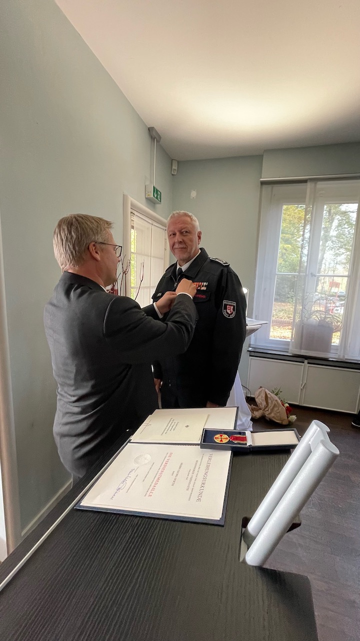 Der Bundespräsident Frank-Walter Steinmeier hat unserem Leiter der Feuerwehr, Jürgen Wirth, die Verdienstmedaille des Verdienstordens der Bundesrepublik Deutschland verliehen. Der neugewählte Kreisdirektor Volker Topp überreichte sie während einer kleinen Feierstunde im Kaminzimmer der Villa Plange in Soest.