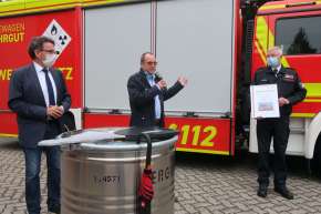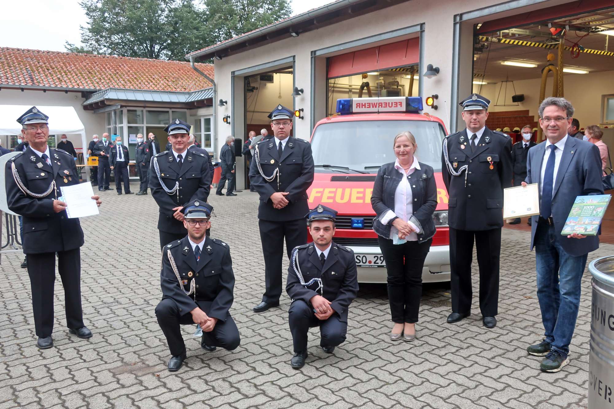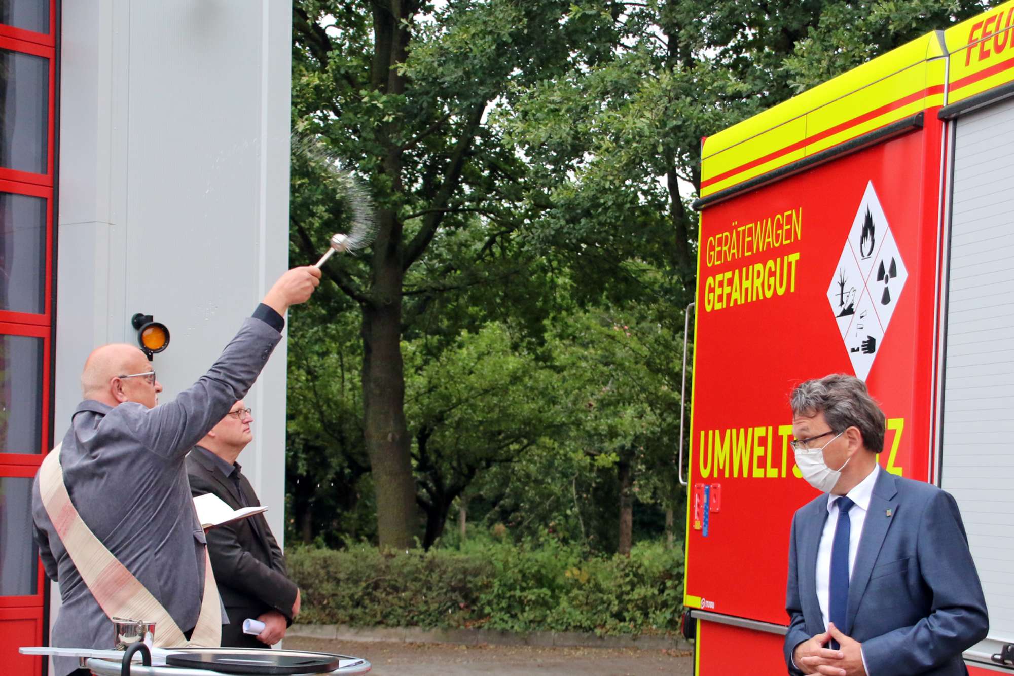 154 000 Euro hat der Zweckbau gekostet, in dem der neue „Gerätewagen Gefahrgut“ künftig parkt. Entstanden ist er in Wilnsdorf bei Siegen – die Firma Iturri setzte einen mit den Soestern abgesprochenen Aufbau auf ein MAN-Fahrgestell mit Automatik-Getriebe. Neun Meter lang ist das Sonderfahrzeug, 3,30 Meter hoch und 2,50 Meter breit, unbeladen wiegt es 15,5 Tonnen. 290 PS Motorleistung beschleunigen bis auf 105 Stundenkilometer. Sechs Einsatzkräfte können mitfahren, und an Bord hat der rote Riese Geräte und Einsatzmittel für die Bekämpfung atomarer, radiologischer, biologischer und chemischer Gefahren. 520 000 Euro haben Soest, Bad Sassendorf, Lippetal und Möhnesee gemeinsam in die Hand genommen, um den Ersatz zu ermöglichen für einen inzwischen 30 Jahre alten MAN für drei Einsatzkräfte und Material. Geübt wird längst mit dem neuen Fahrzeug, der Hallenanbau steht auch schon seit dem Frühjahr – nur die geplante Einweihung zog sich hin, weil auch der ABC-Zug gegen Corona kein Mittel hatte. Auf Abstand und selbst im Freien mit Mund-Nase-Schutz, so lief der kleine Festakt am Donnerstagabend ab: Bürgermeister Eckhard Ruthemeyer und Soests Wehrführer Jürgen Wirth lobten die Einsatzkräfte, den Zusammenhalt in der anhaltenden Zeit der Pandemie und den gelungenen Abschluss von Bau und Beschaffung. Mit dem neuen Fahrzeug leiste die Feuerwehr aktiven Umweltschutz, unterstrich Jürgen Wirth. Matthias Menne, katholischer Diakon, und der evangelische Pfarrer Bernd-Heiner Röger segneten vor fast 90 Teilnehmern Fahrzeug, Halle und ein Geschenk für besondere Gäste: Aus dem befreundeten 700-Seelen-Ort Sucha in Soests polnischer Partnergemeinde Strzelce Opolskie waren Löschgruppen-Präses Bernard Skouronek, sein Sohn und Stellvertreter Andrzej und vier weitere Freiwillige angereist. Bernadette Deneser erklärte den Zusammenhang – sie ist in Polen geboren, wohnt in Meckingsen, arbeitet mit am Erhalt der Freundschaft: „Wir Meckingser waren vor zwei Jahren in Sucha und haben gesehen, dass die dringend noch ein Auto für die Feuerwehr gebrauchen können.“ Das blieb nicht ungehört: Einen gebrauchten VW-Bulli schenkten die Soester den Freunden, einen Mannschafts-Transporter für neun Leute, der bislang in Deiringsen stand. Bernard Skouronek und seine Truppe bedankten sich mit Freundschaftsurkunden. Gleich nach dem Festakt starteten sie durch: Bernard Skouronek: „Zum Frühstück wollen wir wieder in Polen sein.“