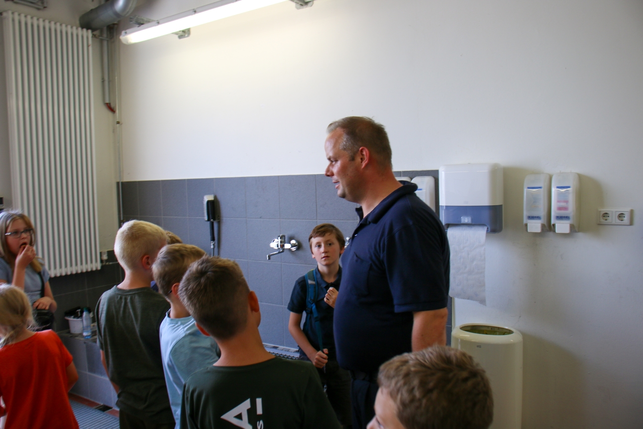 Danach ging es weiter in die Umkleide. Dort wurde den Kindern erzählt, wie ein Einsatz abläuft, welche Kleidung die Einsatzkräfte in einem Einsatz tragen und welche Ausrüstung bei einem Brandeinsatz zusätzlich benötigt wird. Zusätzlich konnten sehen, wie sich eine Einsatzkraft mit einem Atemschutzgerät ausrüstet und wie sich dann die Atemgeräusche anhören. Dies hört sich meist recht eigenartig an, doch die Kinder merkten, dass sie keine Angst haben müssen, sollten sie ein solches Geräusch hören. „Das sind die Geräusche der Feuerwehrfrauen und -männer, die euch retten wollen. Davor braucht ihr keine Angst haben“, sagte ein Feuerwehrmann.