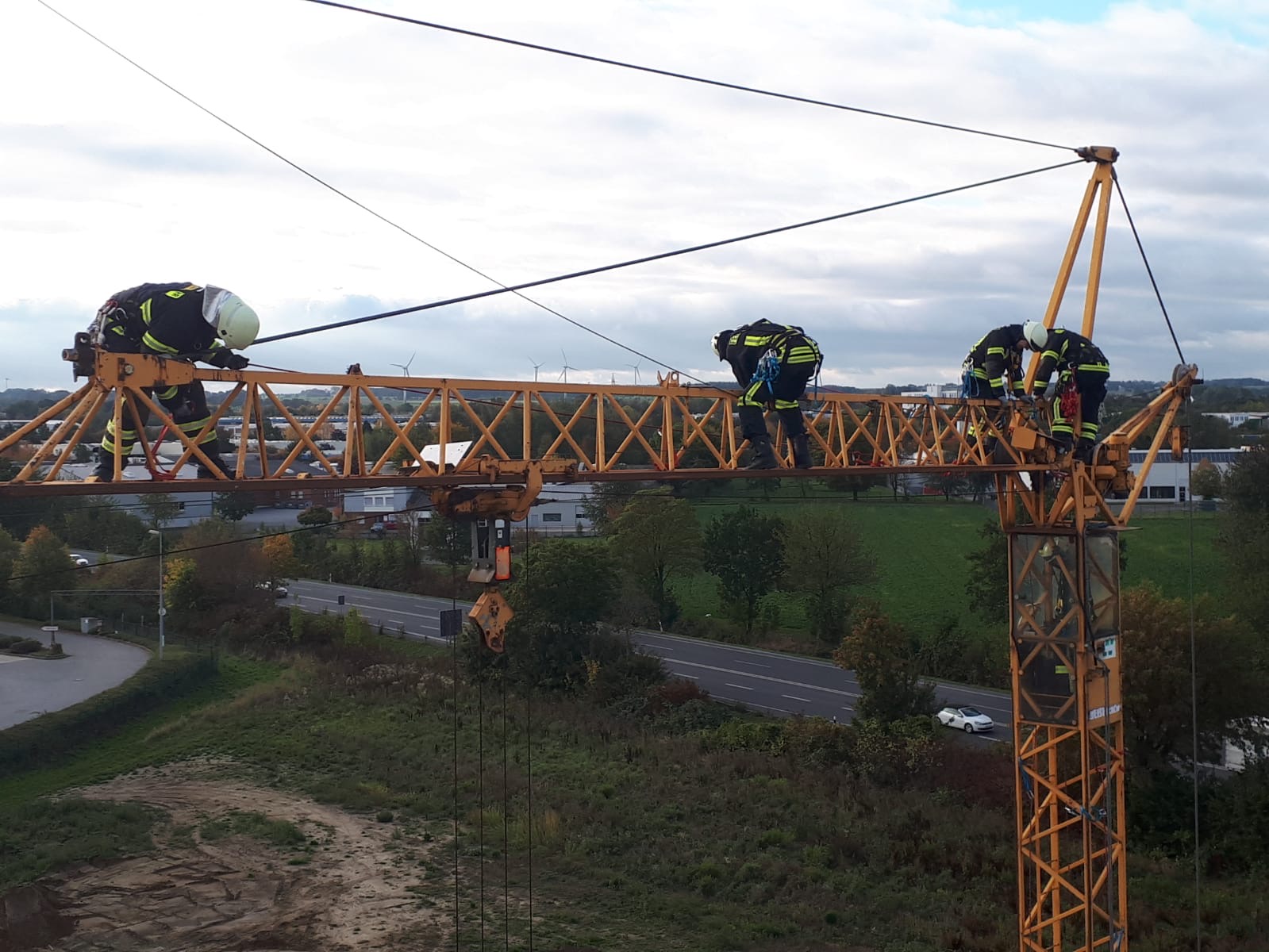 Feuerwehrleute aus Soest und Möhnesee stehen unter einem Baukran. „Schnell!“, ruft der Einsatzleiter „Der kann sich da nicht mehr lange Festhalten“