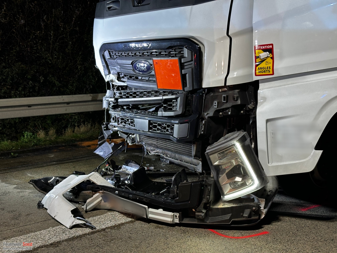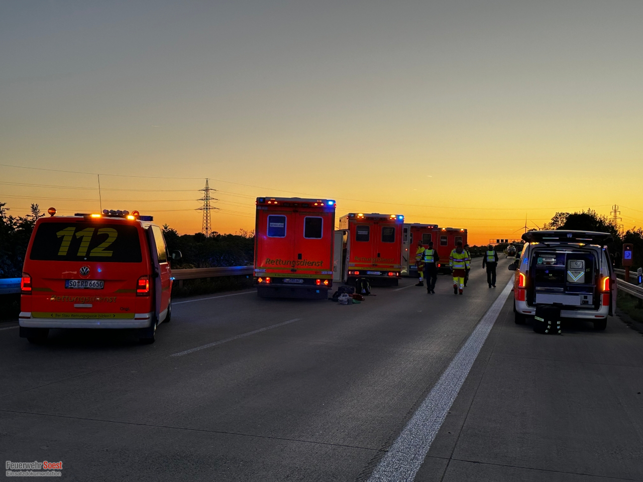 Auf der A44 Fahrtrichtung Dortmund ist es hinter der Anschlussstelle Soest-Möhnesee zu einem schweren Verkehrsunfall gekommen. Ein Lkw war auf einen Pkw aufgefahren und hat diesen massiv verformt. Als unsere ersten Kräfte eintrafen, war eine Person noch in dem Unfallfahrzeug eingeklemmt. Zwei weitere Personen sowie der Lkw-Fahrer befanden sich bereits außerhalb der Fahrzeuge. Ein Insasse des Pkw musste vor Ort reanimiert werden. Die eingeklemmte Person war schwerstverletzt und wurde mit einem Rettungshubschrauber in ein Krankenhaus transportiert. Die dritte Person aus dem Pkw war ebenfalls schwer verletzt und wurde mit einem Rettungswagen in ein Krankenhaus transportiert. Der Lkw-Fahrer wurde bei dem Unfall leicht verletzt und wurde auch mit einem Rettungswagen in ein umliegendes Krankenhaus transportiert. Die Person welche vor Ort reanimiert wurde, verstarb noch an der Einsatzstelle. Nachdem all unsere Maßnahmen abgeschlossen waren, leuchteten wir die Unfallstelle weiter für die Polizei aus.