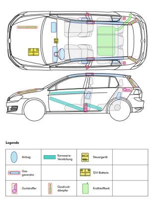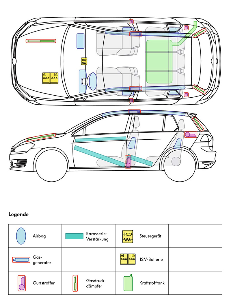 Diese „Rettungskarte“ im DIN-A4-Format gehört aus unserer Sicht in jedes Auto. Sie enthält Angaben über die Position von Karosserieverstärkungen, Tank, Airbags, Gasgeneratoren, Steuergeräten usw. Auch zeigt sie, wo für uns von der Feuerwehr geeignete Schneidbereiche liegen. Um für Retter im Ernstfall greifbar zu sein, muss die Karte bei jedem Pkw hinter die Fahrer-Sonnenblende geklemmt werden.